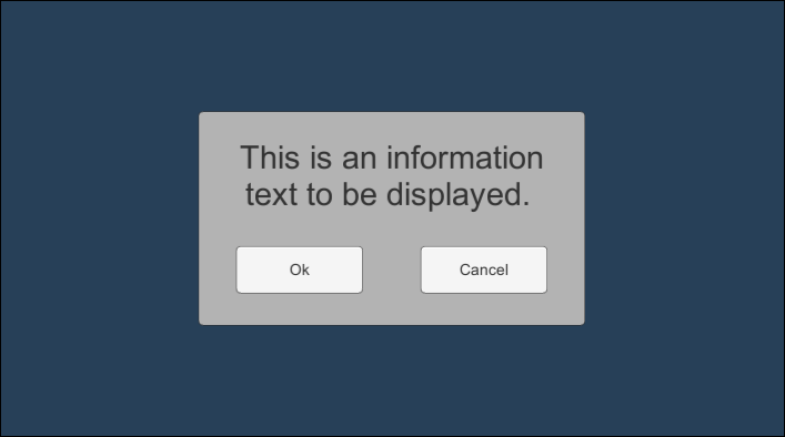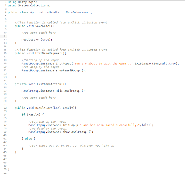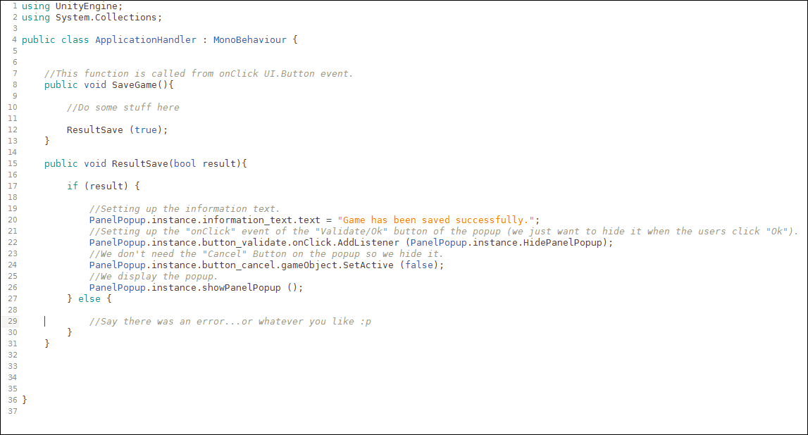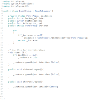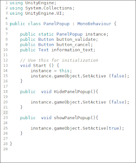 Now what if we want to use the popup for other messages, with another button and in another context. We don't want to have to access and set the components every time, we could save a lot of time and lines of code! To do so let's add a method to the PanelPopup class that will allow us to setup the component just by calling one function (cf Part2).